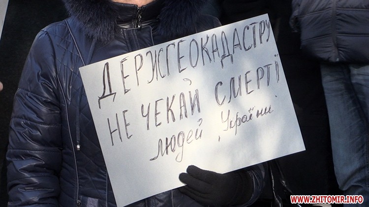 6 лютого з плакатами у руках понад півсотні людей збираються біля головного управління Держгеокадастру в Житомирській області. Вони залишили усі свої справи і приїхали з Черняхова та сусідніх сіл, щоб отримати відповіді на свої звернення, надіслані ще торік.