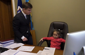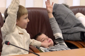 Діти не проґавили моменту відчути себе іще й депутатами, усівшись до крісел у сесійній залі. У якості мера п’ятирічний Іван, у ролі секретаря – Даринка. Розпорядження не по-дитячому дорослі.