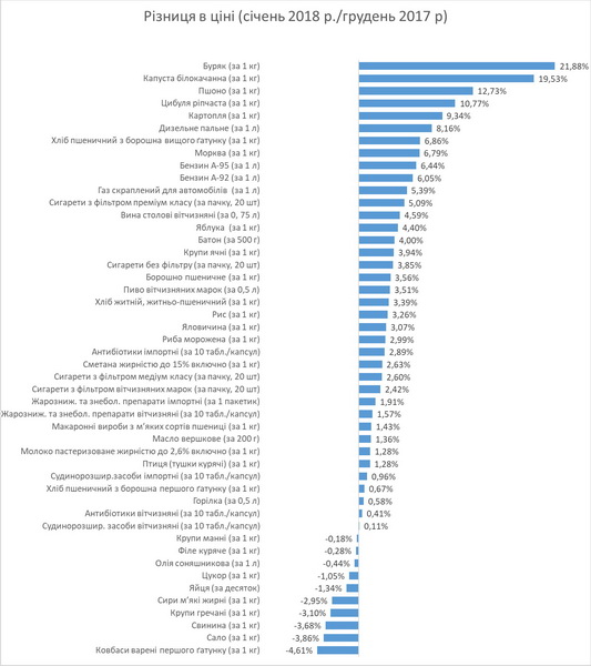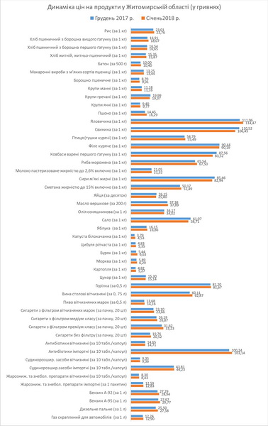 Динаміка цін (тарифів) на споживчому ринку у січні 2018 року: Рис - 23,76 грн за кг, Хліб пшеничний з борошна вищого ґатунку - 18,07 грн, Хліб пшеничний з борошна першого ґатунку - 16,65 грн, Хліб житній, житньо-пшеничний - 15,87 грн, Батон – 10,40 грн за 500 г., Макаронні вироби з м’яких сортів пшениці - 13,44 грн, Борошно пшеничне - 9,01 грн, Крупи манні - 11,16 грн, Крупи гречані - 19,37 грн, Крупи ячні - 9,77 грн, Пшоно - 16,29, Яловичина - 114,47 грн, Свинина - 106,45 грн, Птиця (тушки курячі) - 55,49 грн, Філе куряче - 90,19 грн, Ковбаси варені першого ґатунку - 83,52 грн, Риба морожена - 67,50 грн, Молоко пастеризоване жирністю до 2,6% включно - 21,32 грн за 1000 г, Сири м’які жирні - 82,94 грн, Сметана жирністю до 15% включно - 51,49 грн, Яйця - 25,80 грн за десяток, Масло вершкове - 37,89 грн за 200 г, Олія соняшникова - 34,02 грн за один літр, Сало - 58,71 грн за кілограм, Яблука - 16,86 грн, Капуста білокачанна - 4,53 грн, Цибуля ріпчаста - 5,35 грн, Буряк - 6,63 грн, Морква - 6,29 грн, Картопля - 5,27 грн, Цукор - 15,14 грн, Горілка 0,5 л - 81,67 грн, Вина столові вітчизняні 0,75 л - 62,87 грн, Пиво вітчизняних марок 0,5 л - 14,16 грн, Сигарети з фільтром вітчизняних марок - 23,66 грн, Сигарети з фільтром медіум класу - 26,87 грн, Сигарети з фільтром преміум класу - 33,23 грн, Сигарети без фільтру - 20,52 грн, Плата за оренду 1-кімнатної квартири за місяць - 2517,29 грн, Антибіотики вітчизняні, 10 табл., капсул - 14,71 грн, Антибіотики імпортні - 103,14 грн, Судинорозширювальні засоби вітчизняні - 9,36 грн, Судинорозширювальні засоби імпортні - 44,23 грн, Жарознижувальні та знеболювальні препарати вітчизняні, 10 табл - 8,43 грн, Жарознижувальні та знеболювальні препарати імпортні, 1 пакетик - 12,83 грн, Стоматологічні послуги, одиниця - 231,89 грн, Бензин А-92 - 28,94 грн за літр, Бензин А-95 - 29,77 грн, Дизельне пальне - 27,58 грн, Газ скраплений для автомобілів - 12,90 грн, Проїзд у міському транспорті - 3,45 грн за один квиток, Дошкільна освіта, день - 17,69 грн, Послуги у сфері страхування особистого транспорту, вартість страхового полісу - 719,69 грн.