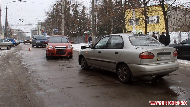 У Житомирі 16 лютого на вулиці Ольжича, поблизу нічного клубу «Каньон», зіштовхнулися дві машини: автомобіль таксі Daewoo та Chevrolet.