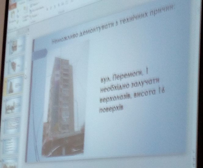 Мова йде про рекламу на будинку №1 по вул. Перемоги. На продемонсторованому злайді зазначено, що демонтаж не можливий «з технічних причин».
