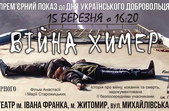 «Війна химер» — український документальний фільм 2017 року, знятий Анастасією та Марією Старожицькими. Це особиста історія про війну, кохання та смерть, зафільмована її безпосередніми учасниками. Прем'єра стрічки відбулася 25 березня 2017 року на фестивалі документального кіно з прав людини Docudays UA. У липні 2017-го фільм брав участь в конкурсній програмі європейських документальних фільмів на 8-му Одеському міжнародному кінофестивал. Стрічка присвячується пам’яті бійця добровольчого батальйону “Донбас” ВАДИМА АНТОНОВА (позивний “Самольот”)», - повідомляють організатори.