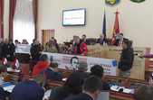 «Звернення депутатів обласної ради до президента України, Верховної Ради України, Генерального прокурора України щодо дій правоохоронців стосовно протестувальників. Я вношу пропозицію включити сюди Міністра внутрішніх справ Авакова, адже це його безпосередня компетенція, і виключити президента України», - зачитує голова Житомирської обласної ради Володимир Ширма.