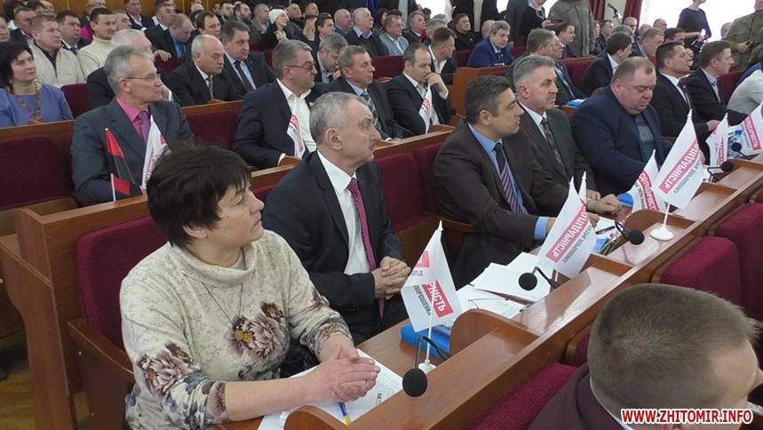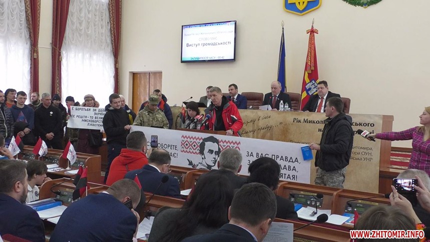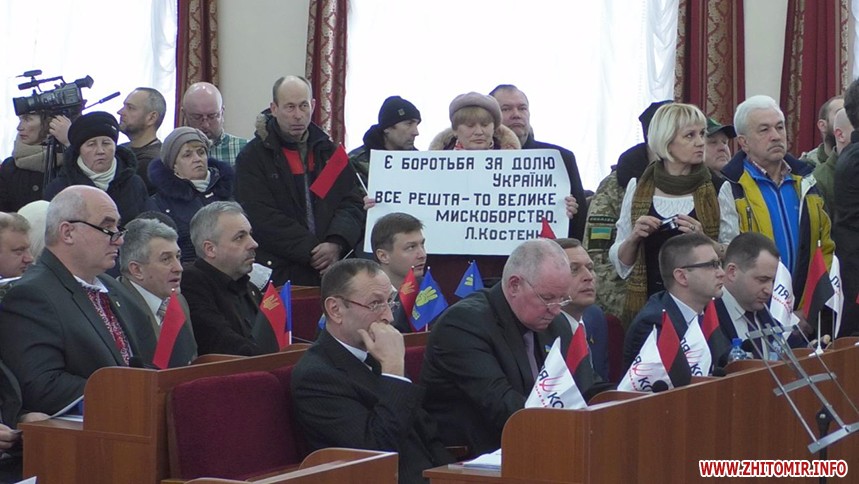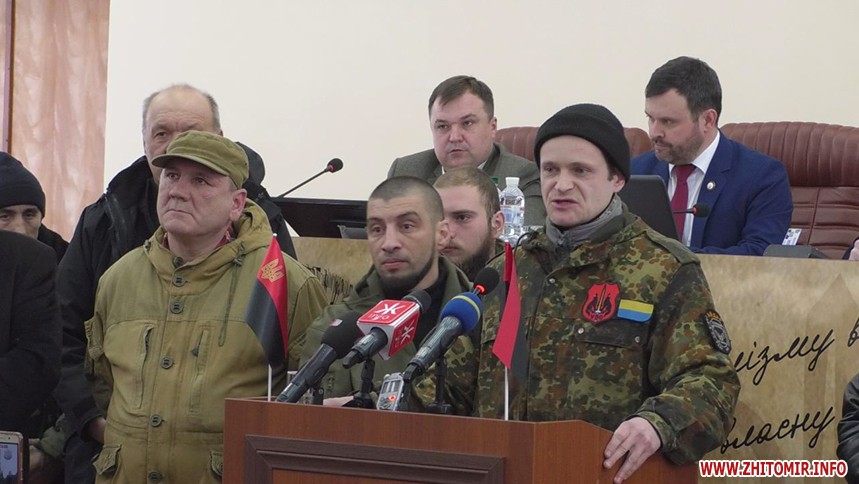 На початку сесії Житомирської обласної ради 7 березня кількадесят представників добровольчих батальйонів блокують трибуну. Останні закликають депутатів прийняти звернення до президента України щодо побиття мирних протестувальників, яке сталося під Верховною Радою 3 березня.