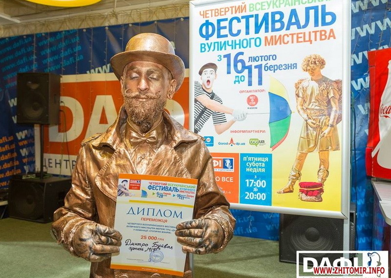 «11 березня в Дніпрі IV Всеукраїнський Фестиваль вуличного мистецтва оголосив переможців: у жанрі «жива статуя»Дмитра Буйвала («Артіль «МІФ», Суми) та лялькаря Сергія Соловйова (Вуличний театр маріонеток Compliment, Житомир). Для Дмитра Буйвала перше місце і приз глядацьких симпатій стали результатом планомірного розвитку - він бере участь у фестивалі вже четвертий рік. Сергій Соловйов, навпаки, на фестивалі вперше, і відразу посів перше місце», - повідомляють організатори.