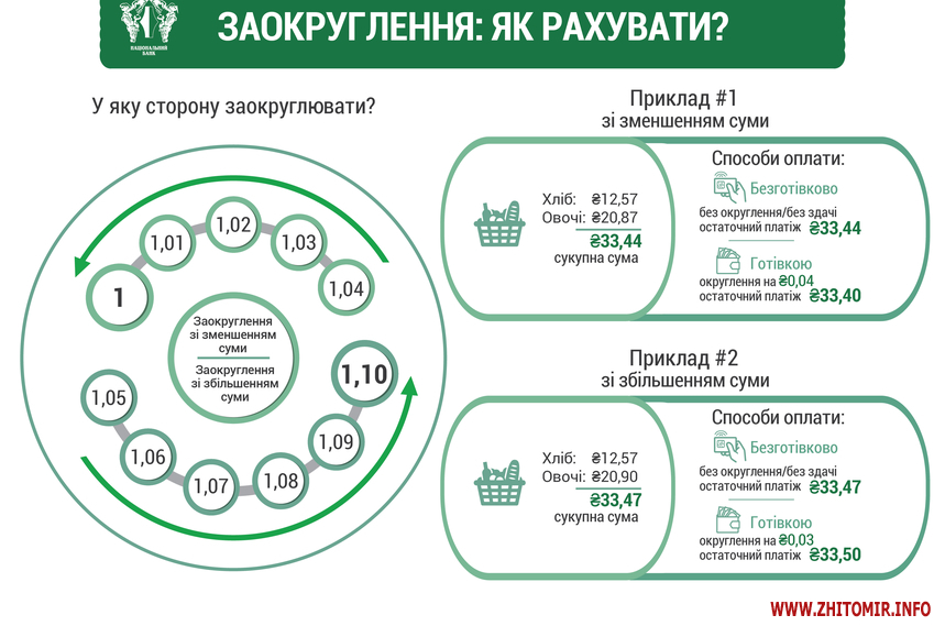 3. Для спрощення розрахунків встановлюватимуться правила заокруглення загальної суми покупки: сума, що закінчується від 1 до 4 копійок, заокруглюється в сторону зменшення до найближчої суми, яка закінчується на 0 копійок; сума, що закінчується від 5 до 9 копійок, заокруглюється в сторону збільшення до найближчої суми, яка закінчується на 0 копійок.