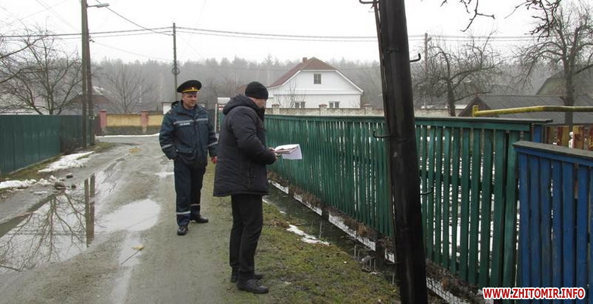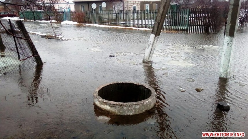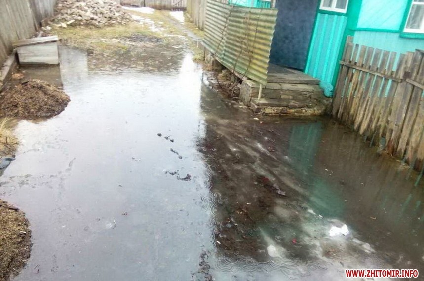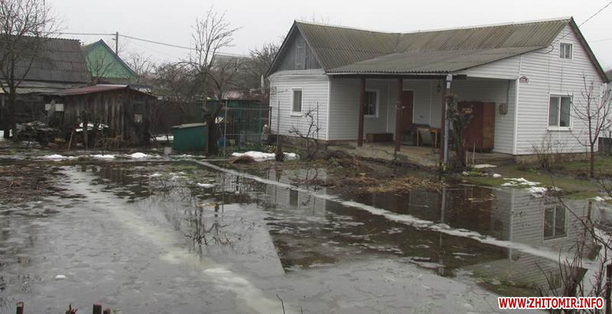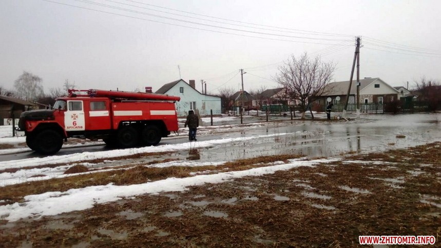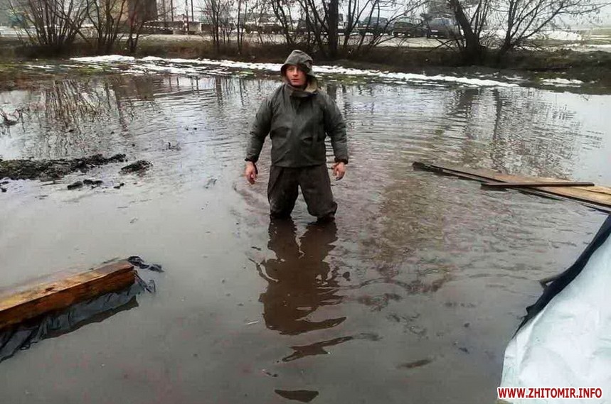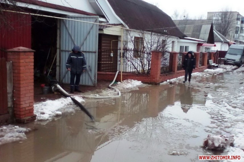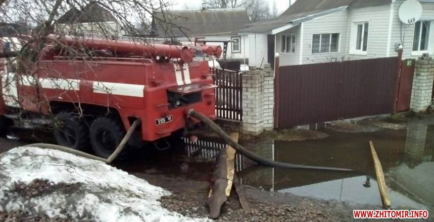 За даними прес-служби, у смт Червоне Андрушівського району внаслідок прориву труби, що відходить від одного із підприємств, стічні води затопили присадибні ділянки селян на площі 10 соток. Бійці ДСНС за допомогою мотопомпи відвели понад 100 кубометрів води. В Олевську та Брусилові насосом пожежного автомобіля відкачали 50 та 120 кубометрів ґрунтових вод з городів. У Житомирі 14 березня рятувальники викачували воду з 2 приватних домогосподарств, розташованих на південній околиці міста. Там вода вже залила підлогу в оселях та підвалах.