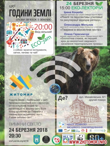 «З 13.00 на Михайлівській можна буде ознайомитись з графічними матеріалами про сортування та переробку сміття, виготовленими на базі дослідження науковців з Житомирського державного технологічного університету. О 15.00 в приміщенні Центру розвитку місцевого самоврядування (вул. Михайлівська 8/1, другий поверх) відбудеться еко-лекторій, де навчатимуть правильно поводитись зі сміттям та безхатніми тваринами, а також розкажуть про створення еко-маршрутів. А вже о 20.00 в тому самому приміщенні розпочнеться відкритий еко-джем, де всі бажаючі зможуть попрактикуватись у музичній імпровізації. Також під час заходу відбудеться презентація треків, що були записані для цієї «Години Землі», де рись євразійська, ведмідь бурий, пелікан рожевий та видра річкова звернуться до українців в DJ треках Yuriy Dvblex. Власне джем відбуватиметься при світлі свічок, адже весь світ символічно відмовляється від необов’язкового освітлення на годину з 20.30 до 21.30», - розповів Ілля Грицанюк.