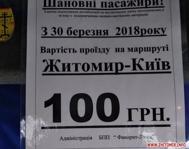«Шановні пасажири! З метою недопущення дестабілізації на внутрішньому ринку автоперевезень у зв’язку з подорожчанням паливно-мастильних матеріалів з 30 березня 2018 року вартість проїзду на маршруті Житомир-Київ 100 грн. Адміністрація БПП «Фаворит-Люкс», - йдеться в оголошенні.
