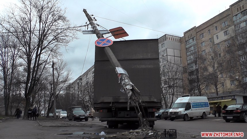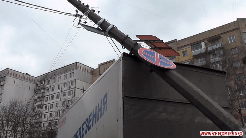У Житомирі 2 квітня близько 15:00 по вулиці Довженка електроопора впала на вантажівку.