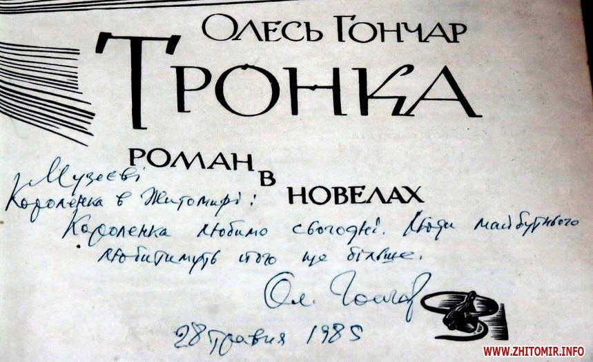 Олесь Гончар не раз бував у Житомирі. На згадку про один з таких візитів лишився його автограф, який від 3 квітня експонується в літературно-меморіальному музеї Володимира Короленка, - розповіли Житомир.info в музеї Короленка.