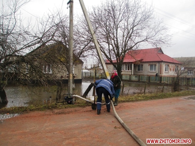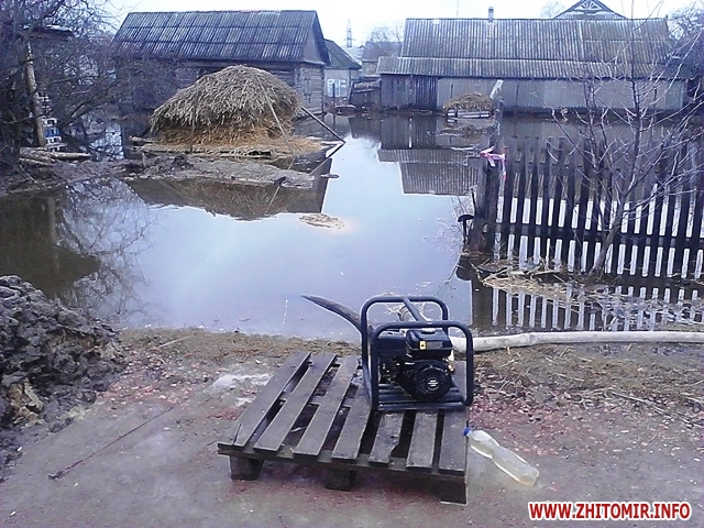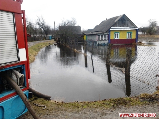 Як повідомила 3 квітня прес-служба управління ДСНС у Житомирській області, 2 квітня працівники рятувальної служби 8 разів відкачували воду із затоплених приватних обійсть в Олевському, Оруцькому районах, селищах Пулини та Ємільчине, а також у місті Житомир. Загалом фахівці ДСНС відкачали понад 2500 кубометрів води.