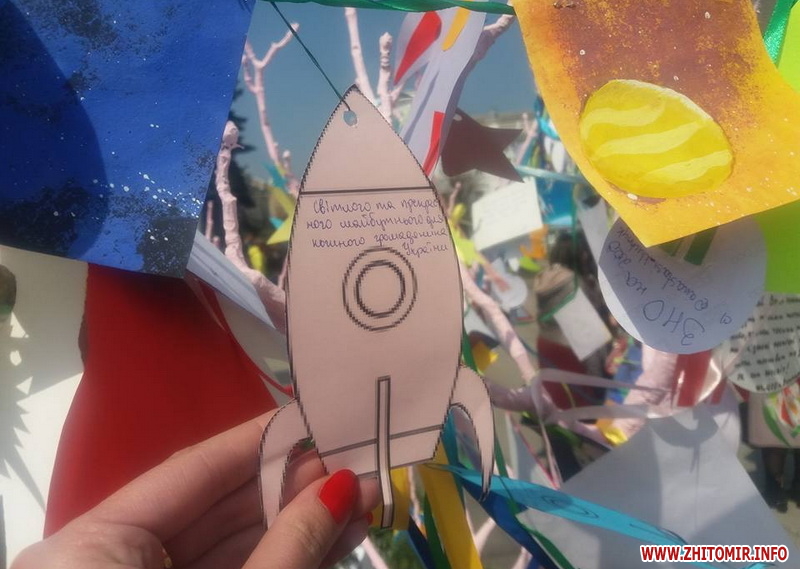 «Сьогодні вперше відбувається такий фестиваль, який приурочений до Дня авіації та космонавтики, він має назву «Космічний день». Учасниками дійства стали діти, які приїхали з усієї області, а також студенти. Всі вони пройшли тематичний квест, було проведене космічне свято і флешмоб. Ми на майдані Корольова встановили дерево космічних бажань, де діти розвісили виготовлені власноруч листівки з побажаннями та мріями. Свято продовжиться і 13, 14 квітня. Завтра фестиваль перенесеться на Троянівську, 20 (стара назва вулиці Якіра), і буде він проходити трішки в іншому форматі. Буде створена еко-зона. Кожен привезе і посадить якусь рослинку, буде з каміння вимощена Велика Ведмедиця. Вже виготовлена космічна ракета, яку будуть розписувати діти. Також буде проходити конкурс «Космічні фантазії», - розповіла заступник директора обласного центру науково-технічної творчості учнівської молоді Наталія Пантус.