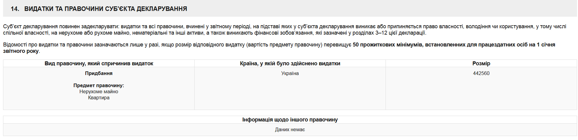 В задекларованому переліку об’єктів нерухомості депутат вказує лише квартиру свого батька, про нове житло відомості є лише в розділі «Видатки та правочини суб’єкта декларування» - вказана ціна і що видатки були здійснені в Україні.
