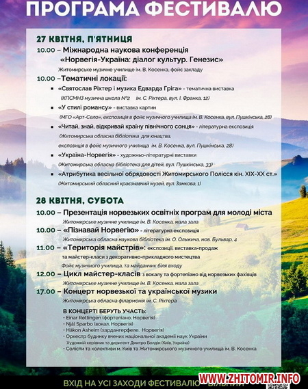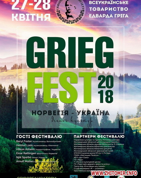 «Різноманітні майстер-класи, міжнародна наукова конференція, літературні та мистецькі виставки, презентація норвезьких освітніх програм та грандіозний фінальний концерт за участі українських та норвезьких музикантів – такою насиченою буде програма міжнародного фестивалю Grieg-Fest, який відбудеться 27-28 квітня у Житомирі в рамках відзначення Днів Європи в Україні. Таку яскраву культурну подію, вже вдруге організовану Всеукраїнським музичним товариством Едварда Гріга, житомиряни зможуть відвідати абсолютно безкоштовно. Програма фестивалю обіцяє безліч позитивних вражень і знайомств не лише з новими людьми, а й з норвезькою культурою», - інформують організатори.