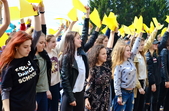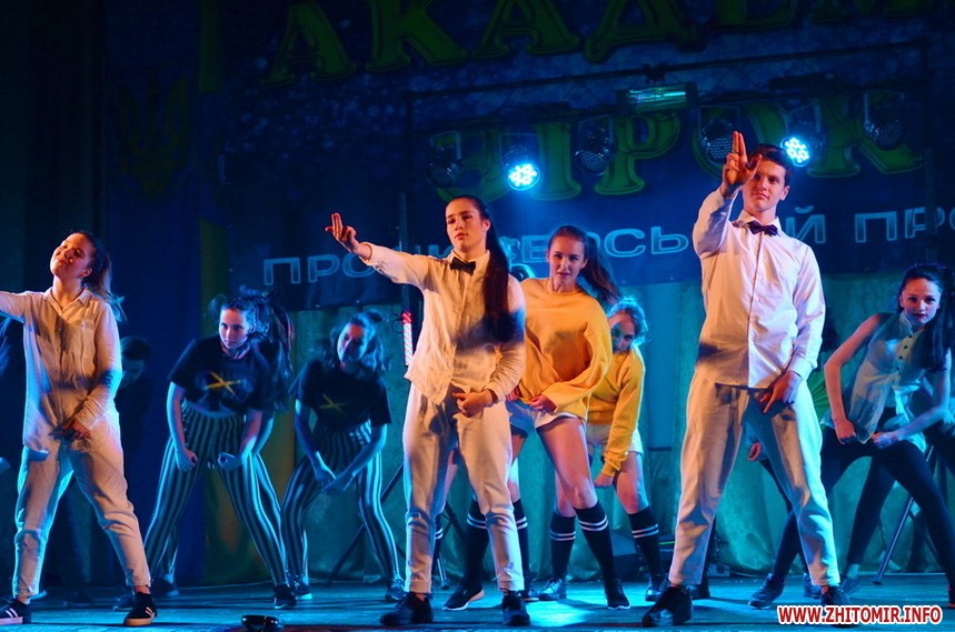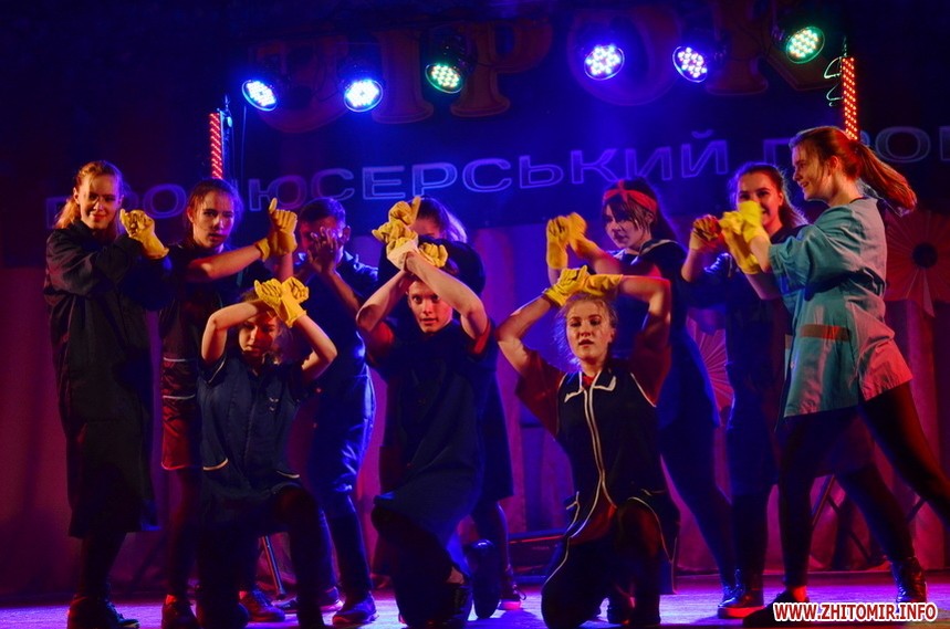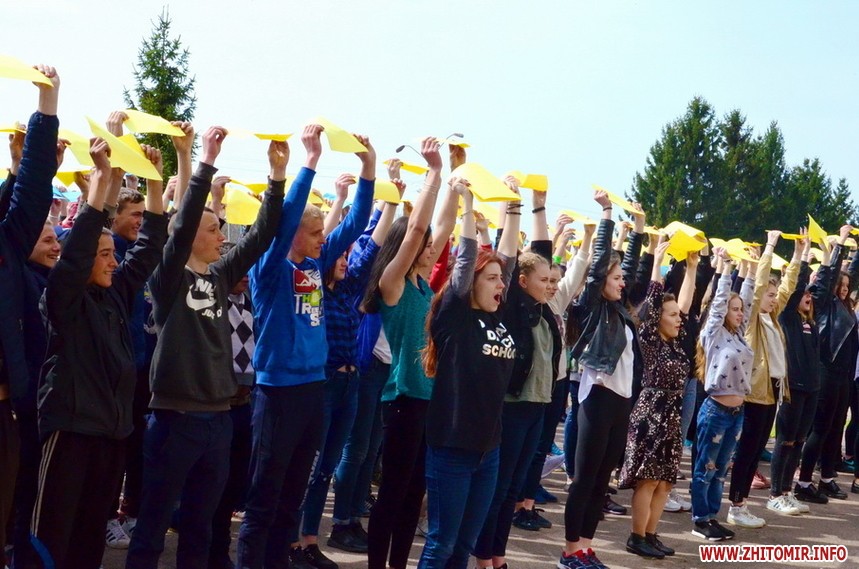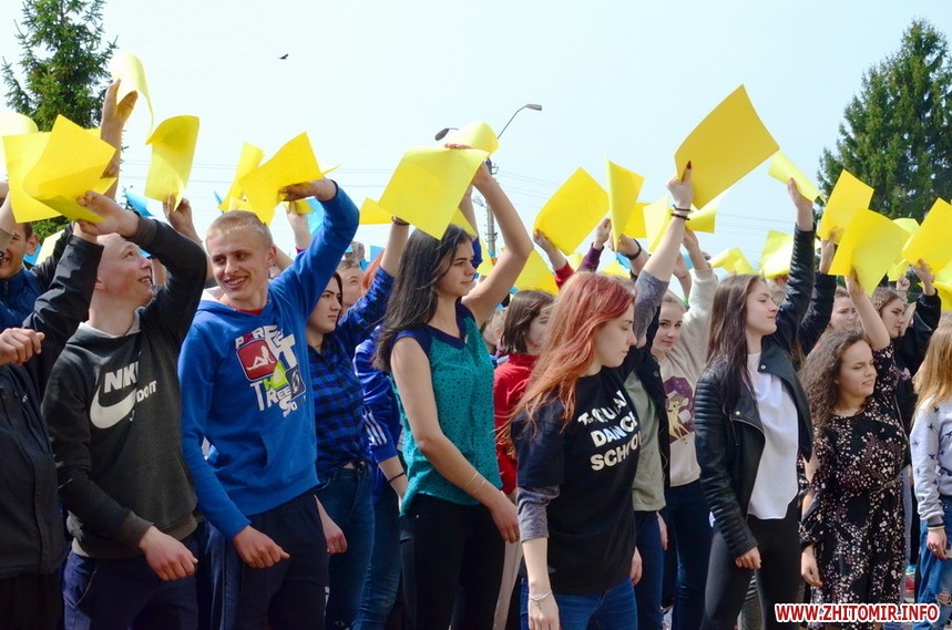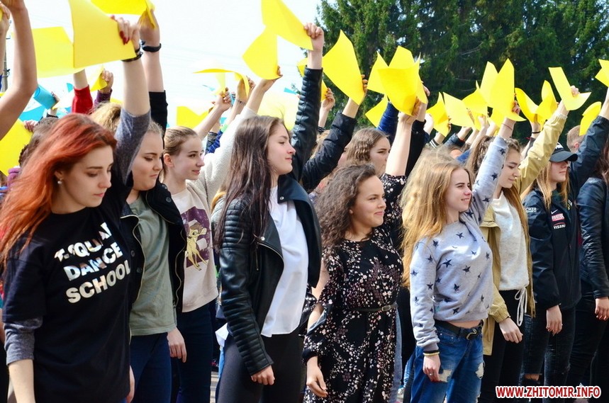 Спочатку на майдані біля Головинського вищого професійного училища нерудних технологій місцеві студенти та учні під керівництвом тренерів та учасників житомирської майстерні танцю "T-Squad" провели патріотичний флеш-моб "Живий прапор України – символ єдності держави!".