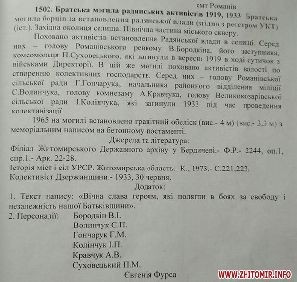 «Як повідомив заступник Романівського селищного голови Віктор Капінус, для процедури розкопок запросили фахівців відповідної служби з Житомира, адже за документами це не просто пам’ятник, а братська могила, де поховані активісти встановлення радянської влади. П’ять осіб зі служби пошуку решток не знайшли, як і слідів поховання. Раніше в селищній раді братську могилу планували перенести на кладовище, вже навіть домовилися про організацію процедури, проте, враховуючи нові обставини, гранітну стелу передадуть для зберігання в ритуальне комунальне підприємство «Сервіс», - інформує сайт.