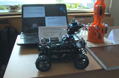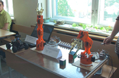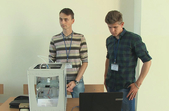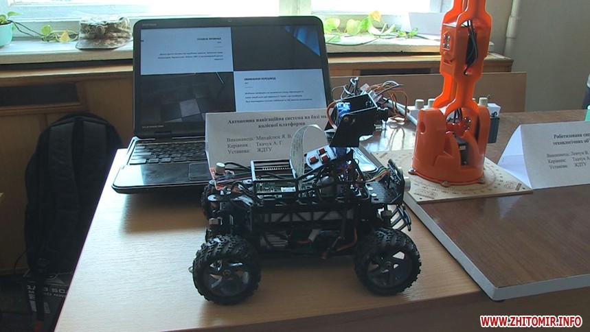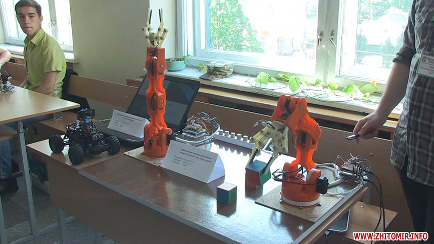«Ці роботи - це міні моделі промислових роботів Кука. Так, вони не настільки точні та потужні, але для дослідницьких цілей, показових стендів вони підходять ідеально. Оператор задає колір і в залежності від того, який нам колір потрібний, він аналізує задані позиції і якщо колір підходить - він його відсортовує. Такі задачі часто задаються на виробництві», - демонструє свою розробку студент ЖДТУ Володимир Левчук.