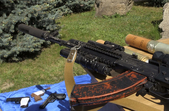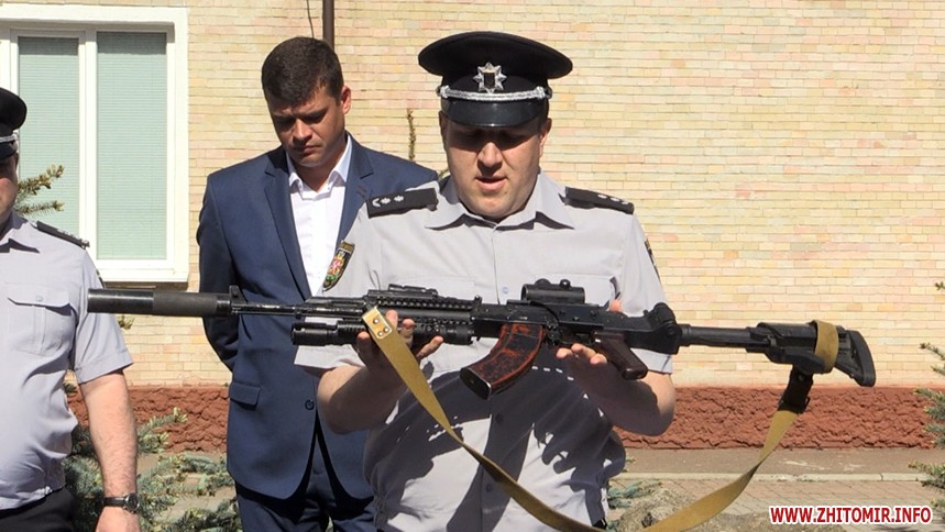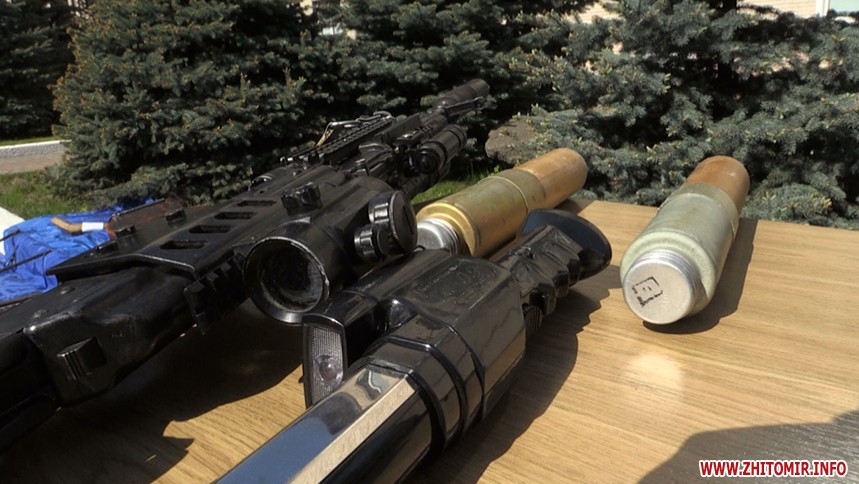 «На даний час актуальною є тема зброї, яка потрапила до нас із зони АТО. На даний час, до нас у Радомишльський відділ поліції громадянин здав автомат Калашникова, на якому поміняна система концентрації, змінені конструктивні дані. Він його знайшов на закинутій фермі. До Малинського відділу поліції в квітні громадянин привіз і здав автомат Калашникова, який він знайшов, з його слів, на пустирі. На ньому є обвісна система, засоби прицілювання, тактичні засоби та засоби для безшумної стрільби. Усе це - бойова зброя. Надзвичайно багато набоїв різних калібрів до бойової зброї та мисливських рушниць. Засоби ініціювання, це називається детонатор 8Ж, яким детонуються підриви. Здали також автомат Калашникова, який згорів. Очисні механізми в нього цілі. Він потрапив сюди із зони бойових дій. А ще здали електрошокер», - розповів начальник відділу контролю за обігом зброї управління превентивної діяльності ГУНП Олександр Господарчук.
