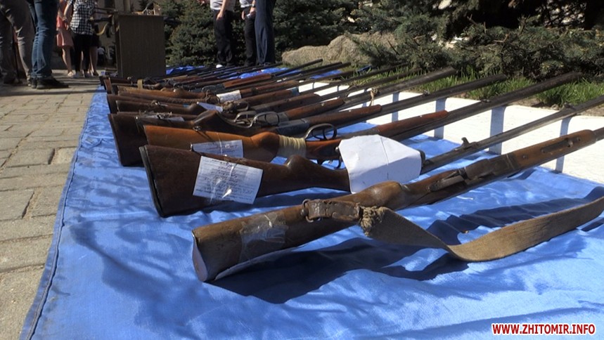 У головному управлінні Національної поліції України у Житомирській області показали частину арсеналу, який громадяни здали у поліцію під час місячника добровільної здачі зброї, боєприпасів та вибухівки. Тут можна було побачити мисливські гвинтівки, так звані саморобні «самопали», револьвери часів Другої світової та навіть модернізовані автомати Калашникова.