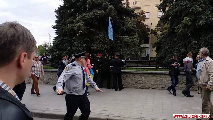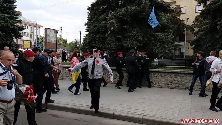 Як повідомляв Житомир.info, зранку, 9 травня, поліцейські намагалися втихомирити активістів, які хотіли повісити на танк прапор з написам «На Москву».