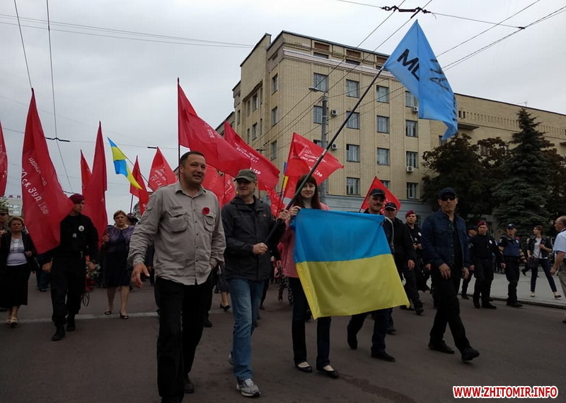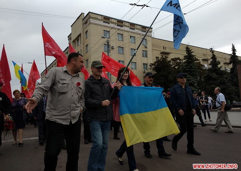 9 травня у Житомирі близько 9:30 колона рушила від майдану Перемоги до монументу Слави. Активісти, які намагалися повісити на танк прапор з написом «На Москву» вийшли перед колоною.