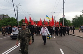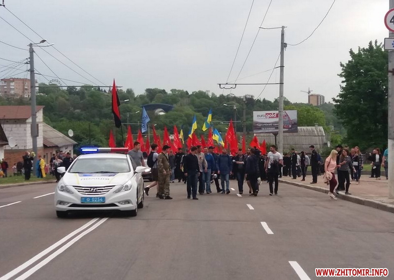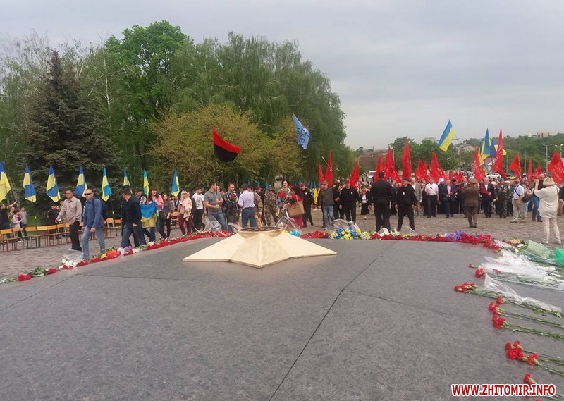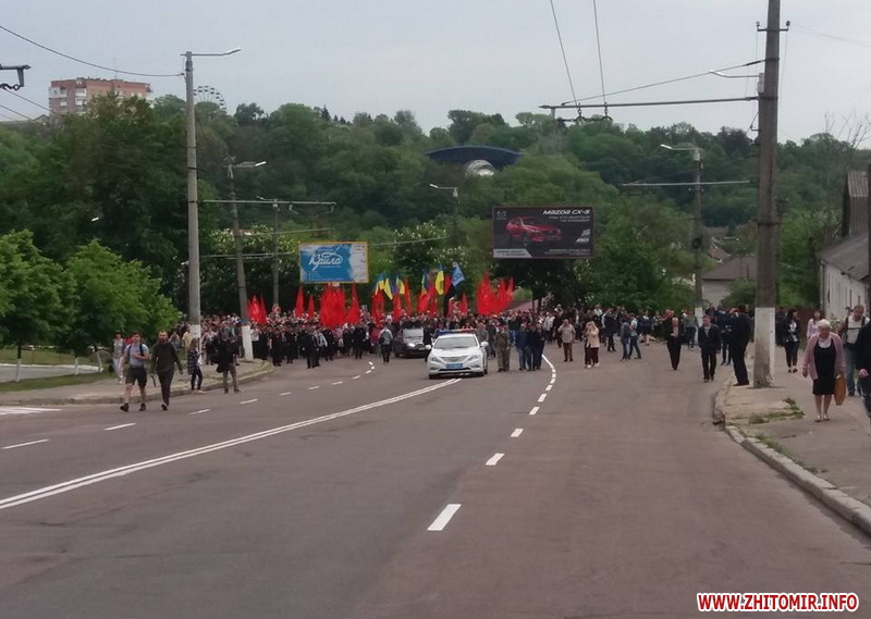 Уранці, 9 травня, у Житомирі колона у складі ветеранів, молоді, активістів, військових, поліцейських та містян пішою ходою вирушила від майдану Перемоги до монументу Слави.