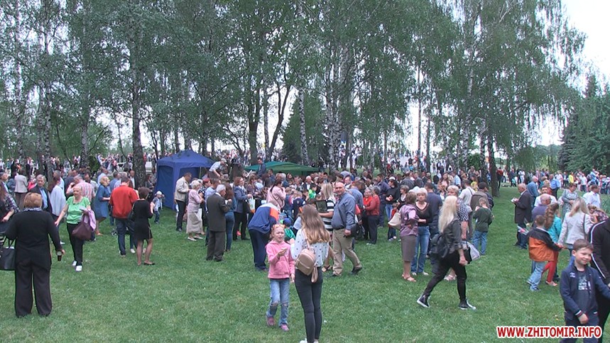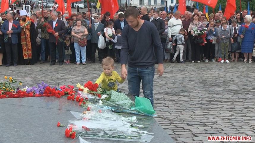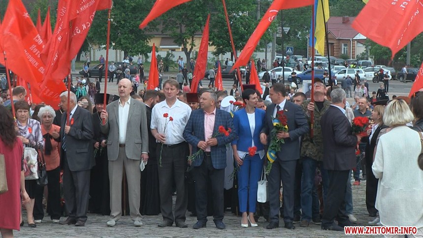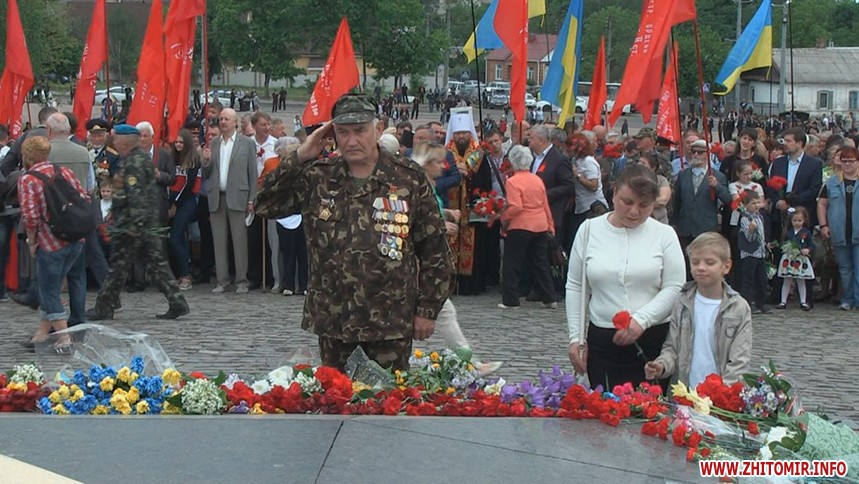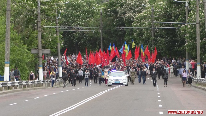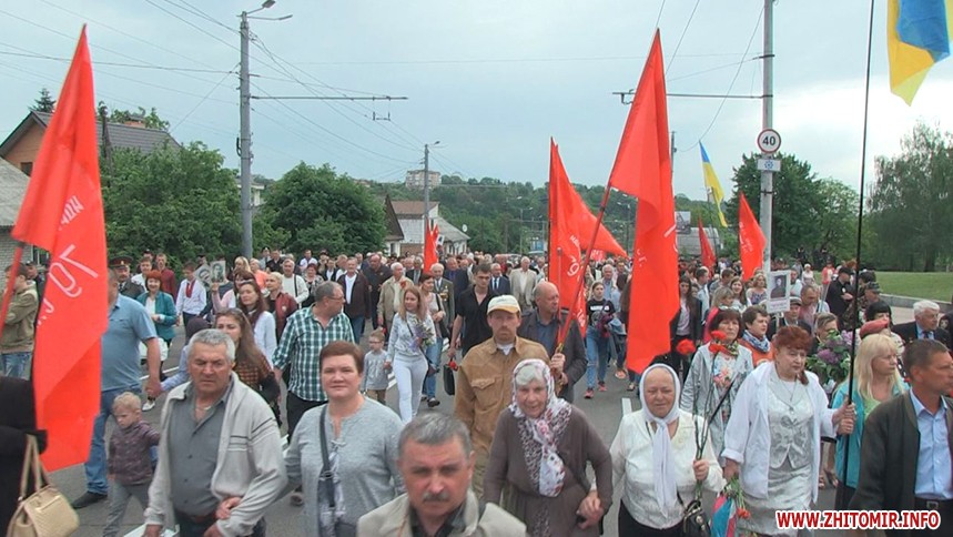У Житомирі пішою ходою до монументу Слави 9 травня прийшли кілька тисяч житомирян. Незважаючи на вранішні штовханини та провокації біля танку на майдані Перемоги, тут, біля «вічного вогню», минулося без сутичок. Люди тримали в руках квіти та портрети своїх родичів, які воювали у Другій світовій війні, згадуючи події 1941 – 1945 років.