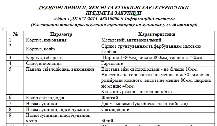 Виконавчий комітет Житомирської міської ради не зміг придбати наProZorro 15 електронних табло на зупинках громадського транспорту через брак пропозицій.