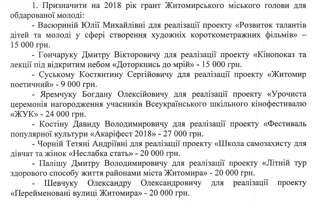 Мер Сергій Сухомлин розпорядився призначити гранти Житомирського міського голови для обдарованої молоді на 2018 рік.