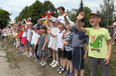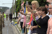 Поблизу Богунського мосту привітати героїв вийшли вихованці дитячого садочку: дітки тримали в руках повітряні кульки, різнокольорові стрічки та жовто-блакитні прапорці.