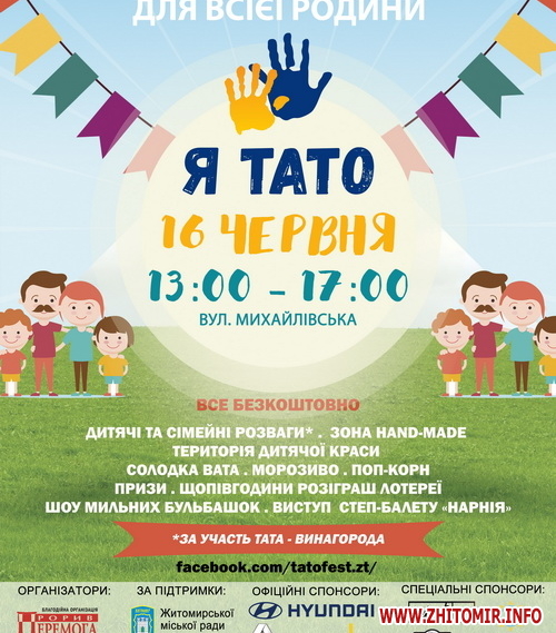 У суботу, 16 червня, на Михайлівській у Житомирі вже вдруге відбудеться фестиваль для всієї родини «Я тато». Розпочнеться він о 13.00 і триватиме орієнтовно 4 години.