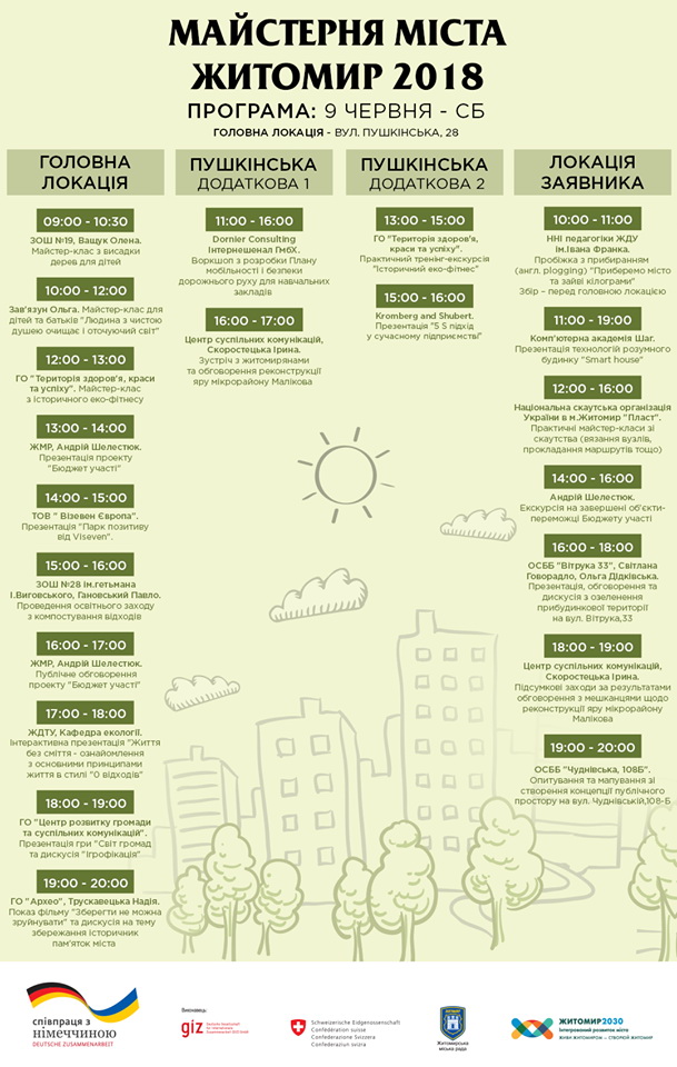 Як повідомляв Житомир.info, «Майстерня міста» в Житомирі проходить утретє, заради цього на 5 днів перекривають Пушкінську. План заходів на кожен день проведення (зі сторінки Майстерні міста у фейсбук):