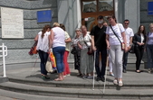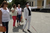 Щоб показати керівництву міста наскільки доступний Житомир для незрячих людей, пані Валентина разом із подругами запросила останніх на квест-прогулянку «Світ на дотик», яка проходить у рамках проведення «Майстерні міста». До акції долучилися заступники міського голови та представник управління капітального будівництва. За правилами організаторів, останні одягають пов’язки, аби опинитися у цілковитій темряві й довіритися відчуттям, та озброюються тростинками. У маршруті квесту: вокзал, поліклініка, будинок для незрячих та магазин. Ми ж ідемо з однією з заступниць мера. З перших кроків Вікторія Краснопір зіштовхується з перешкодою – сходами. Опанувавши себе, вона рухається далі – до магазину. Тут вже набагато складніше, адже потрібно не лише потрапити до приміщення, а і обрати відповідні продукти. Тому, доводиться звертатись до працівниць магазину. Наступний пункт – аптека, щоб дійти до неї Вікторія Краснопір шукає супроводжуючого. А саме, небайдужого житомирянина.