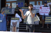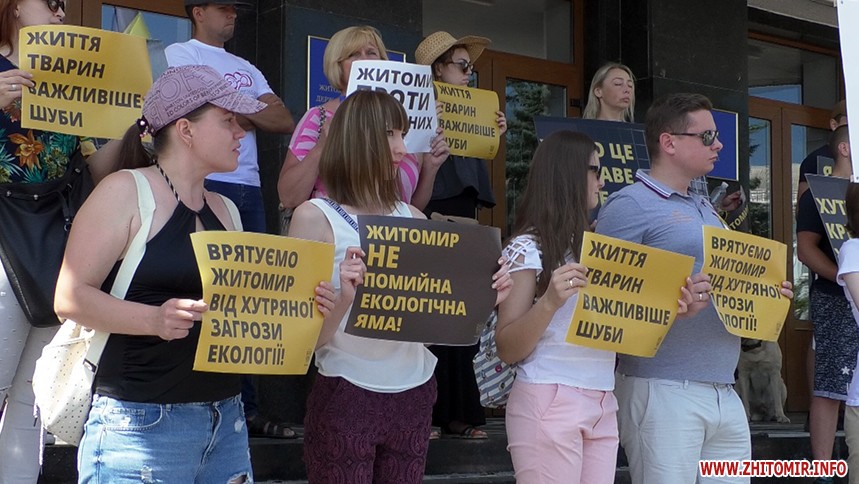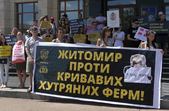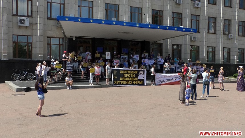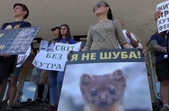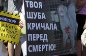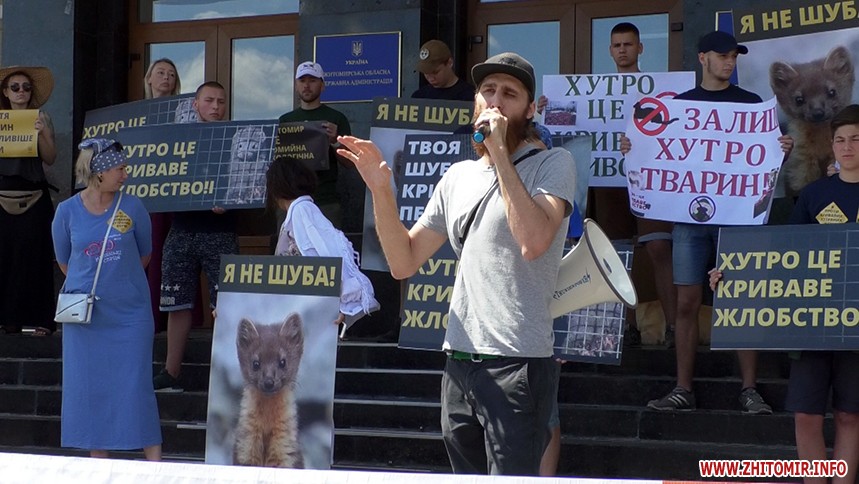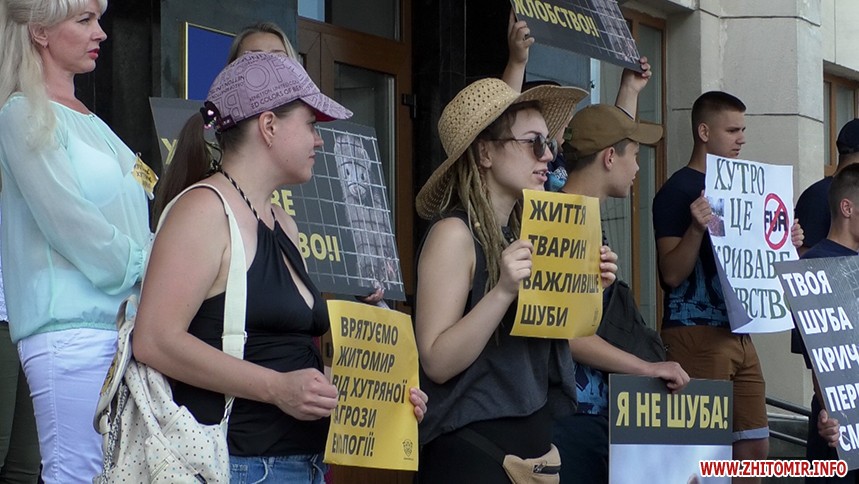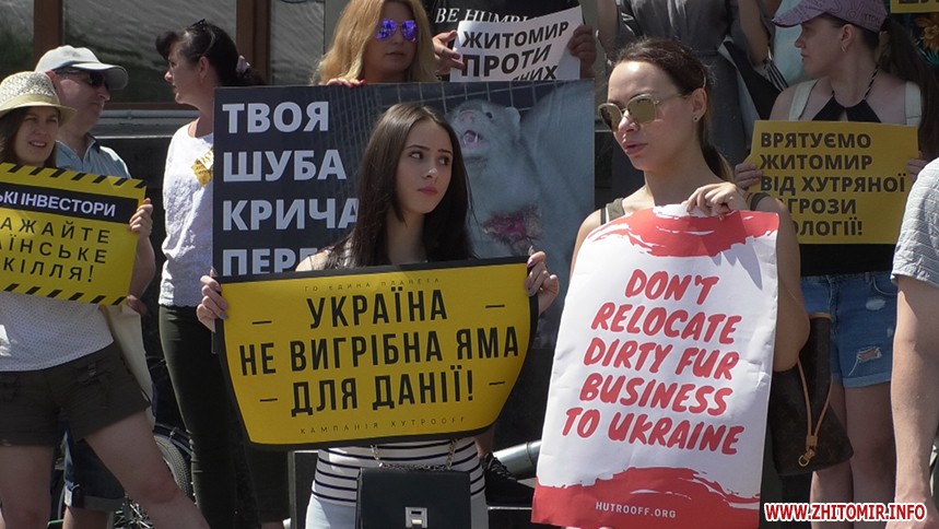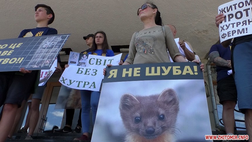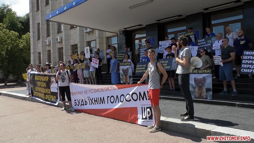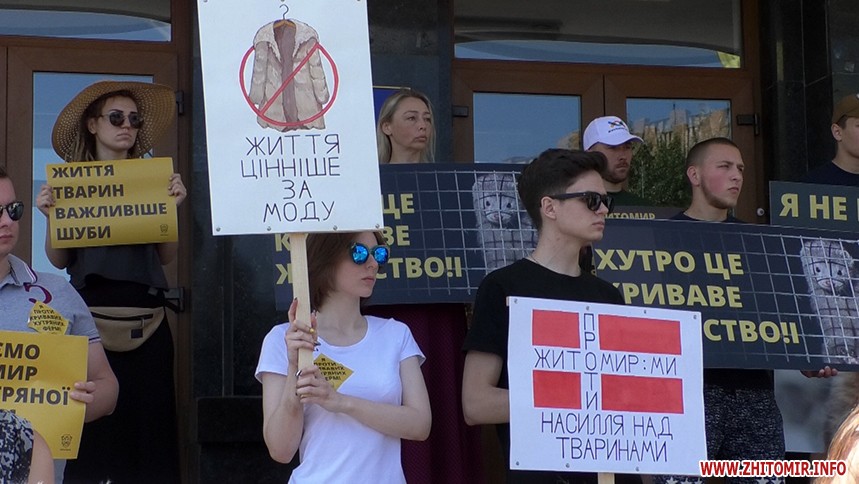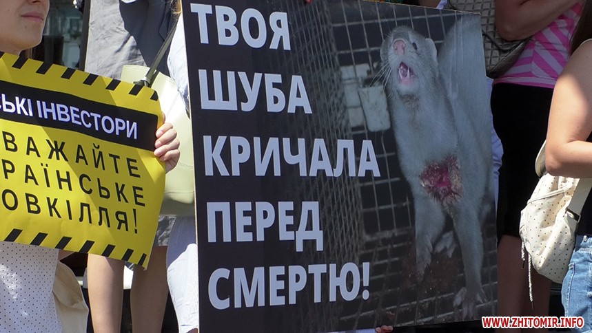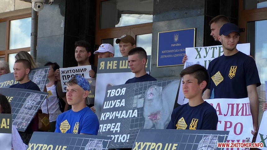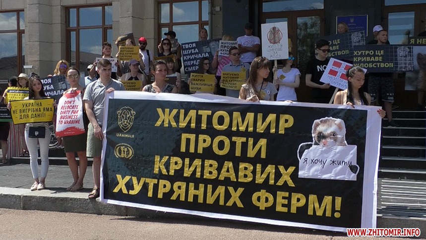 Близько сотні людей зібралися під стінами Житомирської обладміністрації на акцію протесту проти будівництва норкової ферми в Коростишівському районі. У руках мітингарів плакати із написами на кшталт: «Хутро - це криваве жлобство», «Твоя шуба кричала перед смертю», «Залиш хутро тварині».