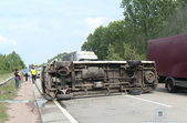 «Дорожньо-транспортна пригода сталась близько 13.40 на 146 км автодороги Київ-Чоп, поблизу с. Кам’янки. За попередньою інформацією, водій автомобіля Mercedes-Benz Sprinter, 54-річний житель м. Сум, не впорався з керуванням, виїхав на зустрічну смугу руху та здійснив зіткнення з відбійником, унаслідок чого автомобіль перекинувся. У результаті ДТП травми різного ступеню тяжкості отримали водій автомобіля та його пасажири: 52 та 45-річна жительки м. Сум та 44-річна жителька Сумської області. Усіх їх було доставлено до лікувальних закладів м. Житомира», - йдеться у повідомленні.