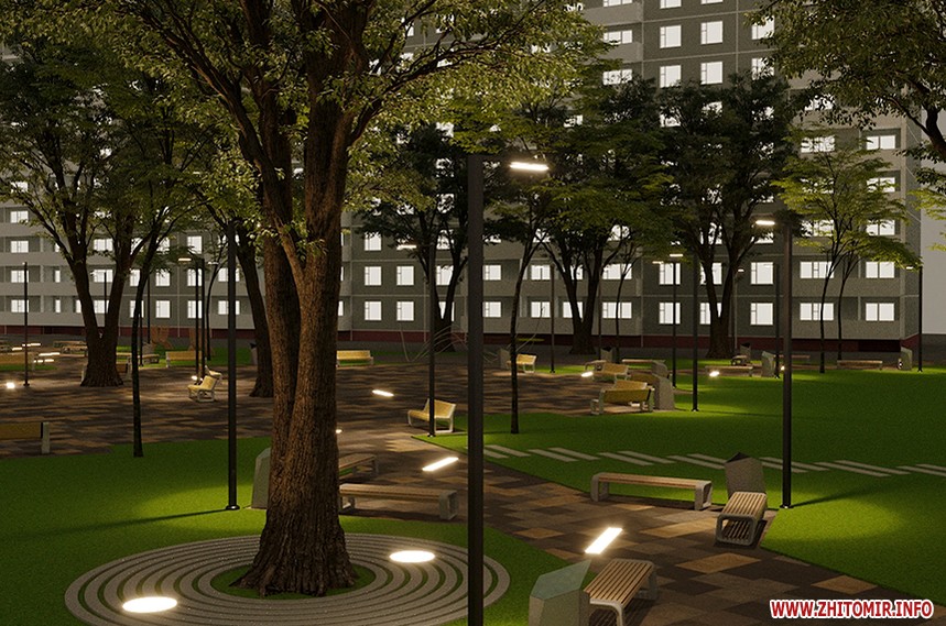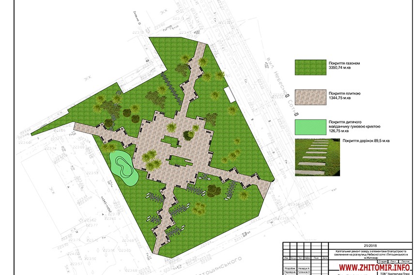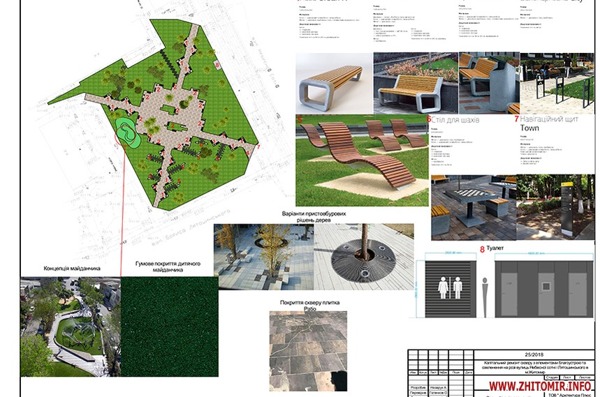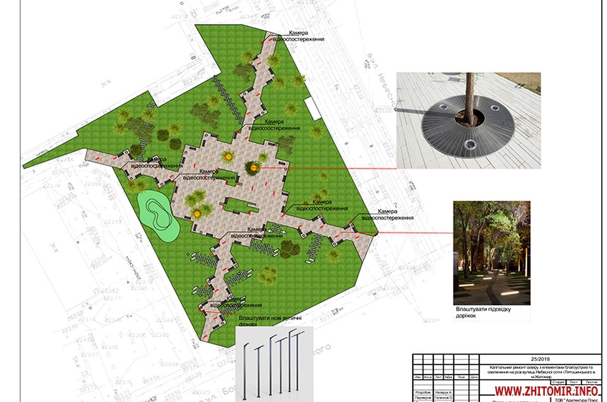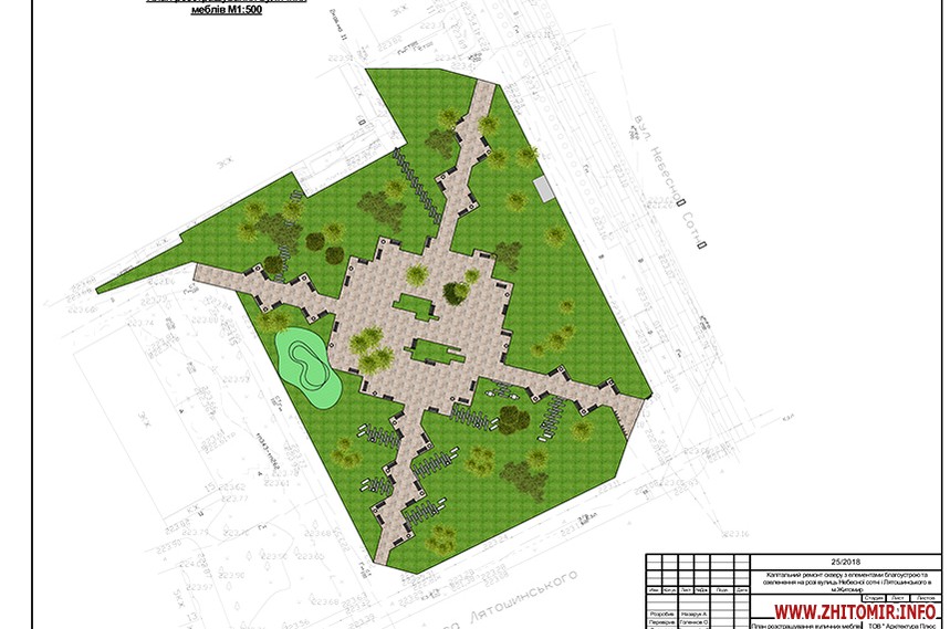 «Ми передбачаємо влаштувати безбар’єрний доступ до цього скверу з вулиці Лятошинського та тротуару з вулиці Небесної сотні, щоб можна було в одному рівні заїхати і не мати на своєму шляху перешкод. Якщо там будуть перепади, то робити пандуси перед з’їздами на проїжджу частину. Укладати також тактильну плитку, яка буде незрячим людям давати розуміння, що вони знаходяться перед проїжджою частиною, перед перехрестям», - розповів головний архітектор Житомира Юрій Безбородов.