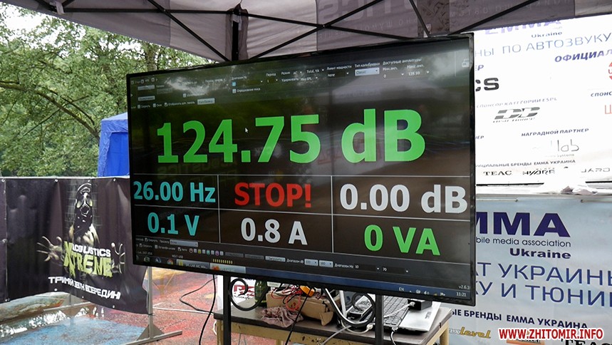 «Сьогодні відбувається захід ЕММА-2018. Це чемпіонат України з автозвуку та тюнінгу. Зареєстровано було приблизно 60 автівок з України, Білорусі та Польщі. Зараз тут 124 децибели. Шум стадіону під час футбольного матчу - це 130 децибел, шум літака - 140, сьогодні тут буде 160-180 децибелів», - розповів директор Житомирського обласного туристично-інформаційного центру Василь Кравчук.