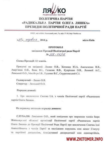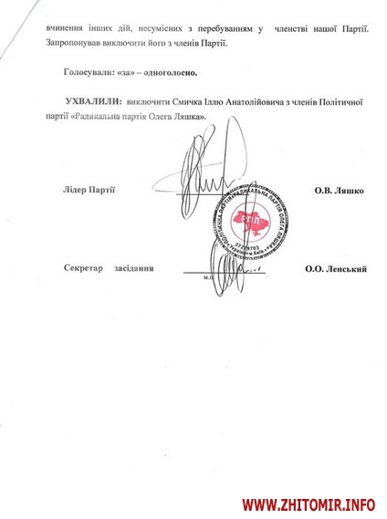 Після звітної частини, Бюро виключило з членів партії депутата Житомирської обласної ради від РПЛ, Іллю Смичка. Бюро порекомендувало обласним депутатам виключити з фракції Іллю Анатолійовича. Було проведено засідання фракції, де Народний депутат України Олексій Олексійович Ленський, за дорученням Олега Ляшка, підтримав цю ініціативу.