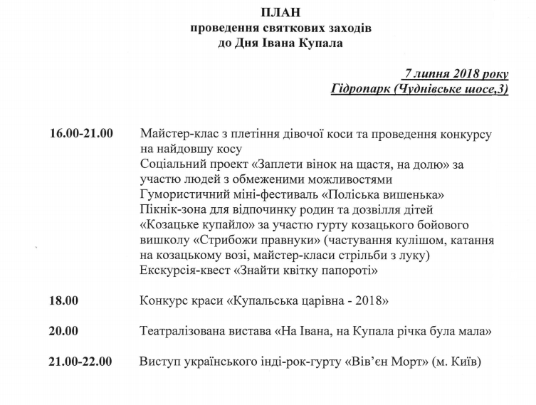 Рішення виконавчого комітету Житомирської міськради «Про проведення загальноміського свята Івана Купала» від 20 червня 2018 року опубліковане на офіційному сайті мерії.