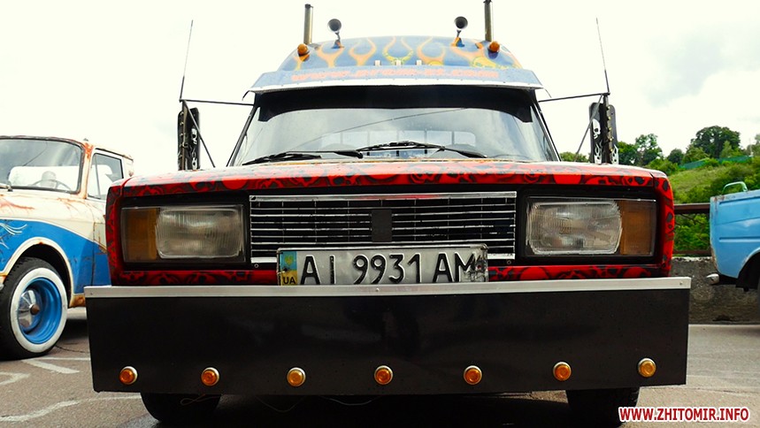 «Ось тут автомобілі, які зроблені в житомирській студії «Кастомгараж», вони по суті являють собою проекти з кастомайзингу автомобілів, намальована аерографія, пінтстрайпінг. Ось Mazda 1979 року, вона єдина в Україні в такому кузові, власник купив її з Одеси та відновив. Ось Lincoln, який колись належав Олександру Пономарьову, відомому українському співаку. Є відновлена BMW Baur Cabrio, таких всього три в Україні, одна з них – в Житомирі, власник відновив її, по суті, до оригінального стану», - розповідає про експонати Михайло Зеленський.
