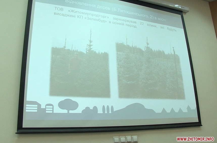 «У нас є представники «Житомирпродторг», колишня назва це ресторан «Смоленськ», які в моїй присутності зарезервували 22 ялини. На фото є керівник цього підприємства, є ці ялини. Наразі вони не в нас, але в розсаднику. Наразі вони знаходяться в ґрунті, тому висадка буде в осінній період. Але ялини зарезервовані і будуть висаджені замість тих, котрі видалили», - повідомив Олександр Шевчук.