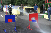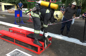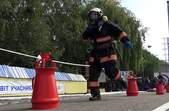 «Перший етап - підйом по триколінній драбині. Другий етап - підйом вантажу 20 кг на другий поверх. Третій етап - пересування бойка вагою 70 кг. Четвертий етап - біг з перешкодами. Газодимозахиснику потрібно вразити мішень за допомогою струменя води і заключний етап - транспортування потерпілого, який важить 80 кг», - розповідає старший помічник начальника зміни оперативного координаційного центру Олександр Ковальський.