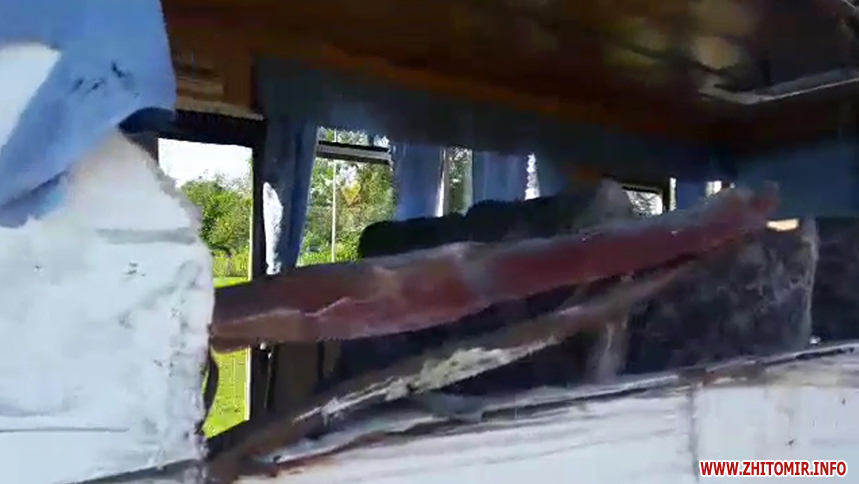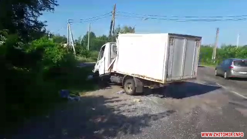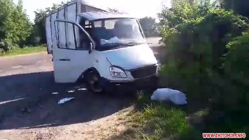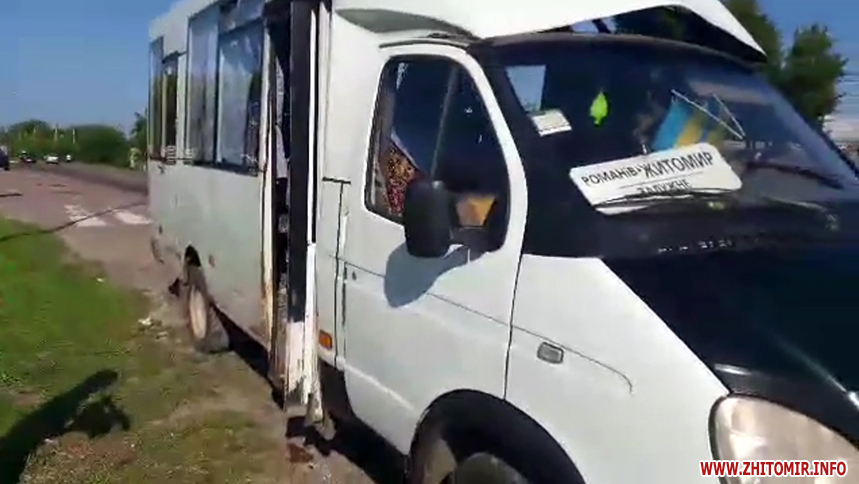 «Аварія сталася на перехресті неподалік заправки. За попередніми даними водій «хлібовозки» заснув за кермом, виїхав на зустрічну смугу і зіштовхнувся з рейсовою маршруткою сполученням Житомир- Романів. Від удару повністю знесло ліву частину маршрутки і ймовірно найбільше постраждали пасажири, які сиділи біля вікна», - розповіли читачі.
