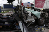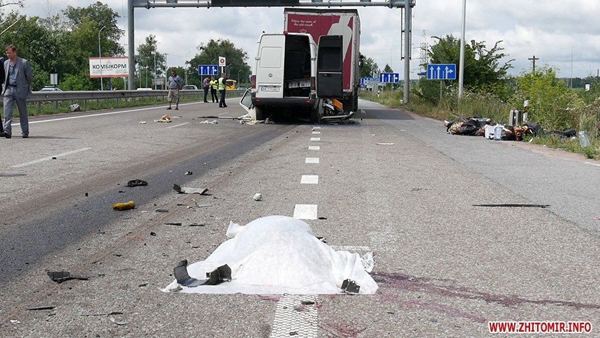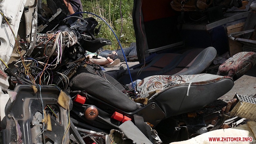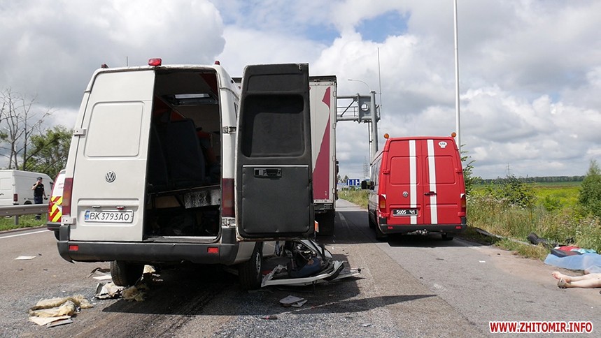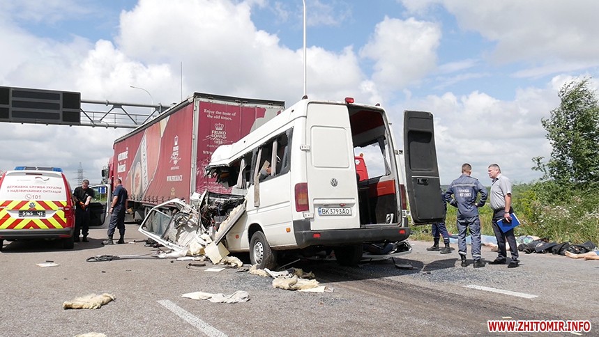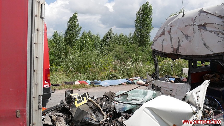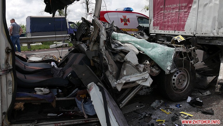 «За попередніми відомостями, водій маршрутного автобусу (вірогідно, сполученням Київ – Рівне), рухаючись у напрямку м. Житомира, скоїв зіткнення з вантажівкою «DAF» з напівпричепом. Станом на 11.30 відомо, що унаслідок ДТП 10 людей загинуло, ще 10 із отриманими травмами різного ступеню тяжкості доставлені до медичних закладів», - повідомляє ГУНП.
