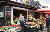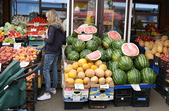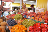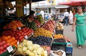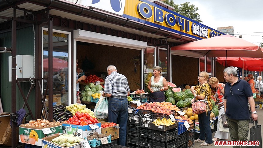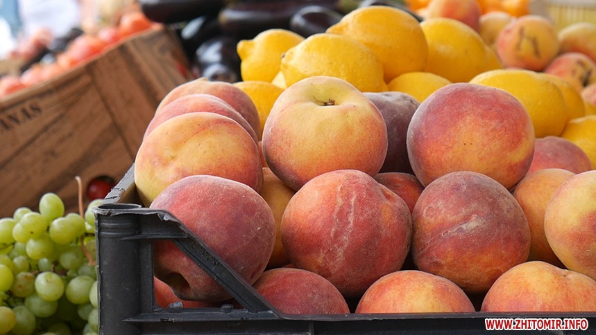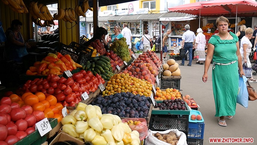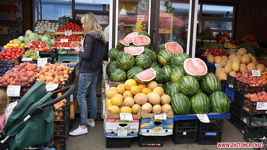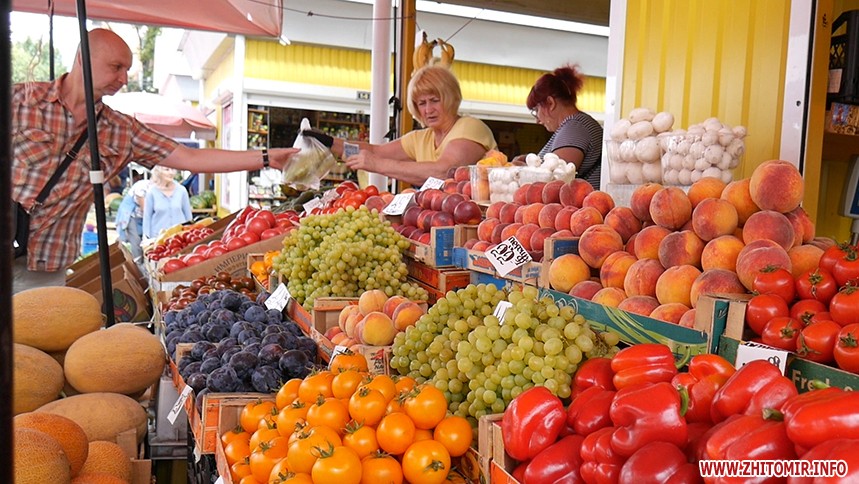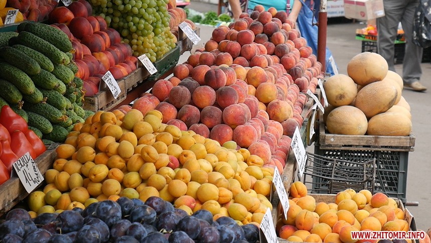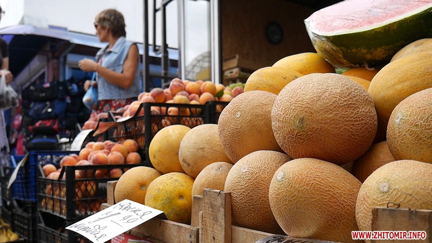 Середина липня, а прилавки на житомирському Житньому ринку «ломляться» від асортименту кавунів, динь, персиків та винограду. Місцеві продавці розповідають: баштанні та персики здебільшого українські, а от виноград та інші екзотичні фрукти завозять з Туреччини. Від походження фруктів залежить і їхня вартість, зізнаються продавці. Проте, кажуть, ціни прийнятні.