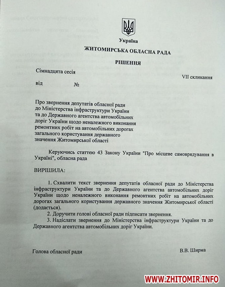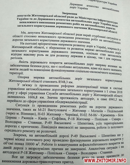 Як повідомляв Житомир.info, за словами віце-прем’єр-міністра України Володимира Кістіона, Житомирська область має серйозне відставання від плану ремонту доріг.