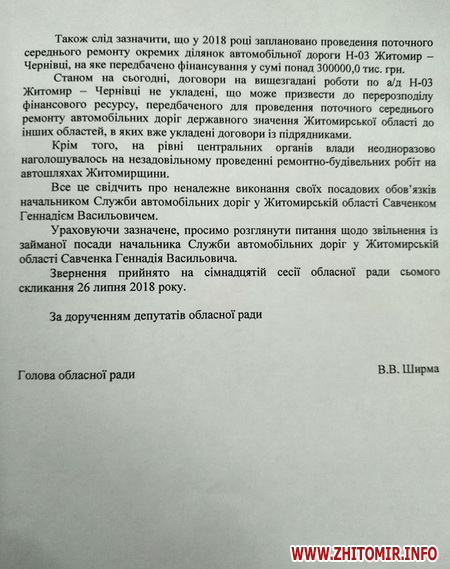 «Просимо розглянути питання щодо звільнення із займаної посади директора Служби автомобільних доріг Савченка Геннадія Васильовича», - зазначається в регулятивні частині звернення.