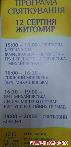 «Я розумію, що християнські цінності та християнський вибір нашу Україну може вивести із багатьох криз. Сьогодні питання християнства активно обговорюється. Якщо брати статистику, то близько 90% людей позиціонують себе як християни тої чи іншої конфесії. Тому ця подія для нас є досить значимою. Чергове святкування дає нам можливість усвідомити те, що ми дійсно християни, і маємо ставити й відстоювати християнські цінності. Рада Церков вирішила виступити з ініціативою та провести в Житомирі хресну ходу. 12 серпня з 15:00 до 16:00 ми плануємо провести спільну хресну ходу, яка буде закликати благословення на наше місто, будемо мати молитву. Починаємо ми її від костелу святої Софії, пропонуємо там очолити молитву Римо-Католицькій церкві. Далі йдемо на майдан Перемоги рухаючись до Спасо-Преображенського собору, повернемо на вулицю Грушевського і до Михайлівської через Покровську. Біля Михайлівського собору матимемо молитву за мир та єдність. Потім рушимо на Михайлівську, до сцени. Опісля плануємо презентацію тих громад, які братимуть участь у заході. Також ми би не хотіли, аби це свято було суто релігійним, тому ми пропонуємо християнський родинний відпочинок на цьому святі. Будуть розважальні точки, де діти і родини зможуть відпочити. І плануємо завершити цей день святковим концертом», - сказав отець Віталій Сидорук.