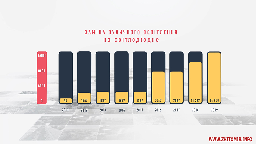 У Житомирі за впровадження сучасної системи вуличного освітлення всерйоз взялися у 2016 і встановили 5200 LED-ліхтарів. Тоді з міського бюджету виділили18 мільйонів гривень, а також скористалися коштами Держфонду регіонального розвитку.